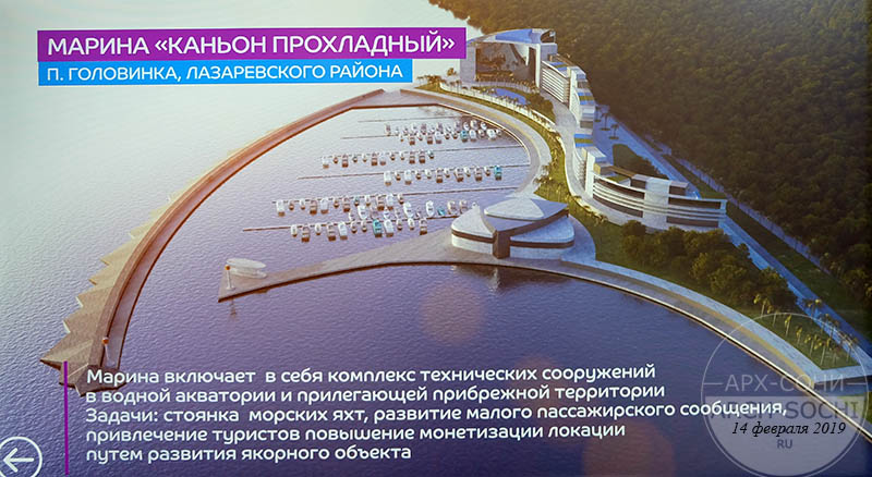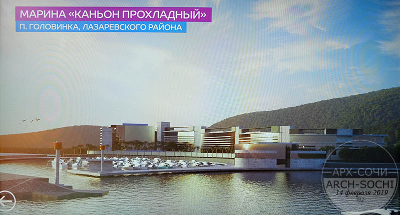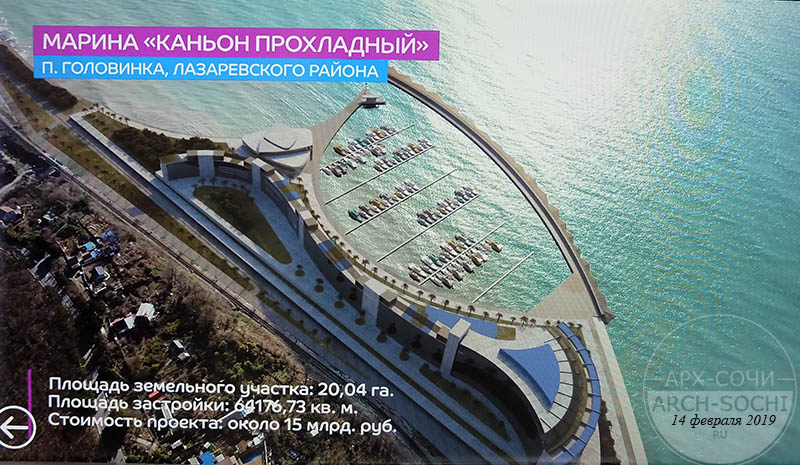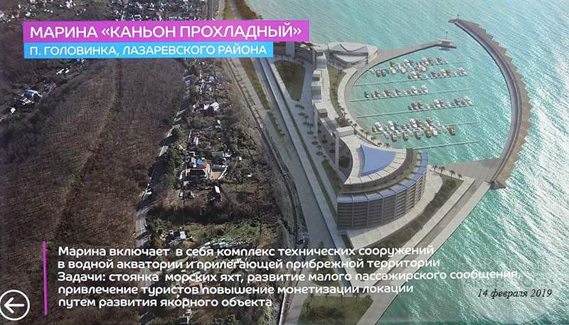 Марина «Каньон Прохладный» на 250 яхт в п. Головинка, Лазаревский район. Марина включает в себя комплекс технических сооружений в водной акватории и прилегающей прибрежной территории. Задачи проекта: стоянка морских яхт, развитие малого пассажирского сообщения, привлечение туристов.